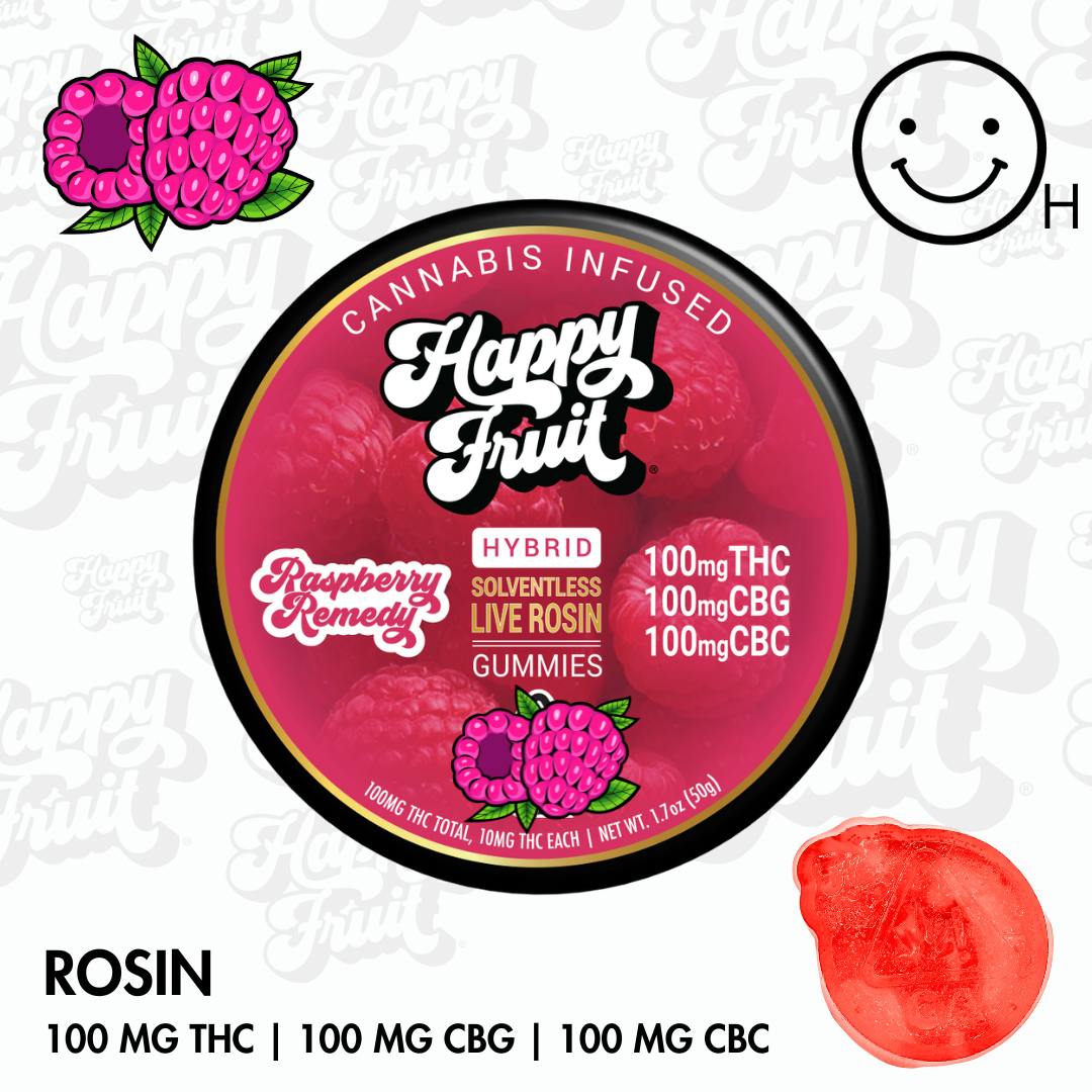 HAPPY FRUIT | RASPBERRY REMEDY (H) | 100MG THC, 100MG CBG, 100MG CBC | ROSIN GUMMIES